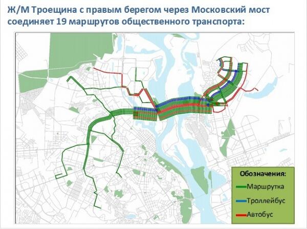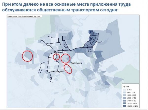 Когда совместно с командой Мирового банка, мы проанализировали существующую маршрутную сеть, соединяющую жилмассив Троещина с Правым берегом, мы обнаружили что ни один из 19 маршрутов не соединяет район с основными местами приложения труда - деловыми районами Киева.