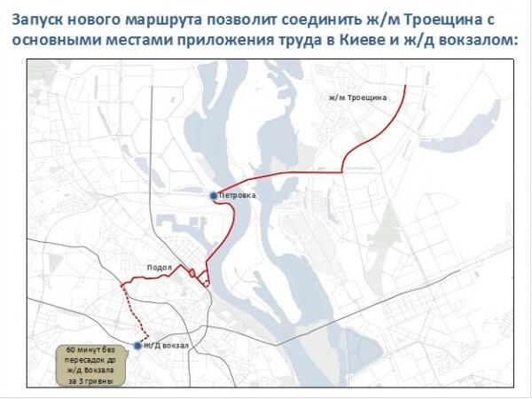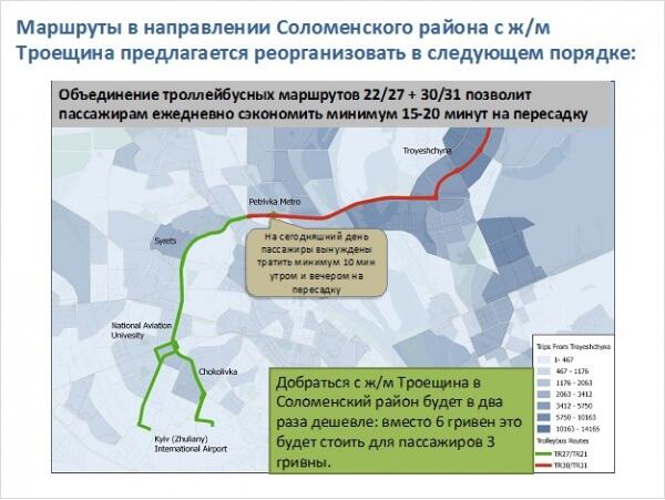 Чтобы решить данную проблему эксперты предложили создать новые маршруты, которые позволять жителям Троещины без пересадок на одном виде транспорта добираться до свих рабочих мест и обратно домой. Как пример, один из предложенных маршрутов:
