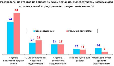 Опрошенные харьковчане интересуются информацией о рынке жилья с различными целями. Для реальных покупателей цели, с которыми они интересуются рынком жилья, практически такие же, как и для всех опрошенных харьковчан. Наибольший интерес к информации о рынке жилья с целью его покупки наблюдается у реальных покупателей (94%). Детальная информация представлена на рисунке 4 .