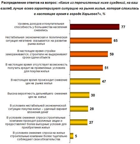 В ходе опроса респондентам было предложено выбрать суждения, которые лучше всего характеризуют нынешнюю ситуацию на рынке жилья в городе Харькове. Среди ответов участников опроса доминируют негативные суждения, которые занимают первые четыре лидирующие позиции на графике (рисунок 6 ).