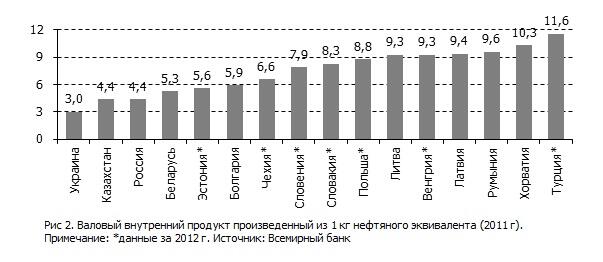 Нет ничего удивительного в том, что Украина является одной из наименее энергоэффективных стран в мире. Основываясь на данных Всемирного банка, из 1 кг нефтяного эквивалента энергии в Украине производят 3 доллара добавленной стоимости. Даже в богатых нефтью и газом России и Казахстане этот показатель составляет 4,4 доллара ВВП на 1 кг нефтяного эквивалента, не говоря уже о европейских соседях, таких как Венгрия или Румыния, экономика которых почти в три раза энергоэффективнее, чем украинская. В то время как эффективность использования энергии в украинском промышленном секторе продолжает улучшаться (в частности, благодаря высоким ценам на газ), Украина все еще значительно отстает от европейских стран по уровню энергоэффективности экономики и, в результате, сильно зависит от импорта газа, несмотря на существенную внутреннюю добычу.
