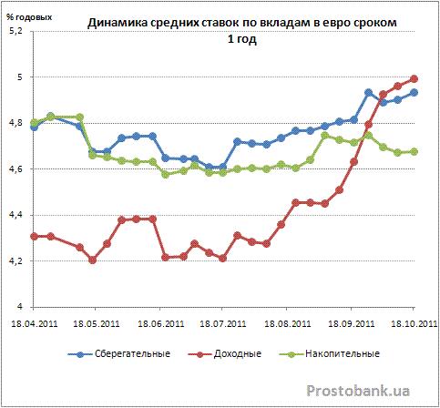 Пять самых прибыльныхвкладов в евро сроками от одного года и более от банков из числа 50-ти лидеров по активам по исследованиям компании «Простобанк Консалтинг» на 17 октября 2011 года (не учитывались депозиты к совершеннолетию и вклады для пенсионеров, а также депозиты с минимальной суммой 2000 евро и более):