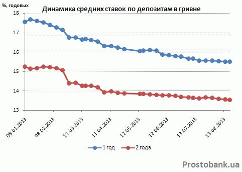 Однако ставки по популярным у вкладчиков среднесрочным гривневым депозитам с начала 2013 года неуклонного снижаются, как и ставки по другим валютам и срокам. По исследованию компании «Простобанк Консалтинг», с начала января-2013 до середины августа-2013 максимальные ставки по депозитам сроком на год уменьшились на 4,25 процентного пункта – с 26,25% до 22% годовых. А по вкладам сроком на два года за этот период они просели на 3,5 процентного пункта – с 25% до 21,5% годовых.
