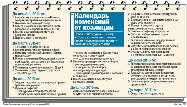 Сегодня новоизбранная Верховная Рада на своем первом заседании подпишет Соглашение о коалиции. Планируется, что документ, вокруг которого месяц велись жаркие споры, станет своего рода календарным планом реформ для Украины (см. инфографику). Список изменений длинный, но пока это только обещания, которые, как известно, вполне могут не воплотиться в реальность. Ведь говорить — не выполнять, тем более всегда можно найти сотню причин почему "мы хотели, но не смогли". "Сегодня" составила список обещанного, надеясь что он станет неким напоминанием для власти, а также выяснила, чего ждут люди разных профессий от грядущих новшеств.