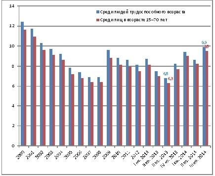 Госстат сообщил, что по итогам третьего квартала 2014 года уровень безработицы среди трудоспособных граждан Украины достиг рекордных 9,9%. За последний год, по официальным данным, потеряли работу 586 тыс. граждан непенсионного возраста, а также 514 тыс. работающих пенсионеров.