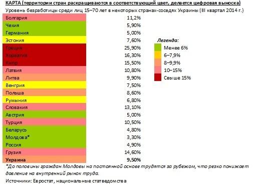 Уровень безработицы в Украине пока что находится на среднеевропейском уровне : в третьем квартале безработица в 28 государствах ЕС составила 10,1%. Самая благополучная европейская страна — Норвегия (3,6%), а неблагополучные — Греция и Испания, где не имеет работы каждый четвертый (25,9% и 24,2% соответственно).