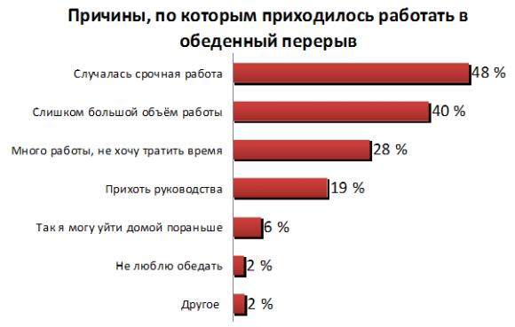 Согласно данным, 17% офисных сотрудников созналось, что работают вообще без перерыва на обед или отдых, а перерыв каждого второго длится меньше часа. При этом 95% офисных сотрудников хотя бы однажды приходилось работать во время перерыва, часто из-за срочной работы. Тогда как каждый пятый сотрудник вынужден работать вообще без обеденного перерыва из-за прихотей руководства.