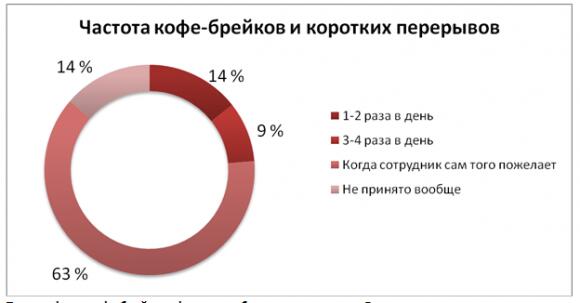 Кроме основного длинного перерыва, на работе бывают и короткие, во время которых можно с удовольствием выпить чаю или кофе, пообщаться с коллегами. Но, тем не менее, 14% опрошенных признались, что в их компаниях не принято отвлекаться от работы на кофе-брейки. 63% респондентов могут устроить себе кофе-брейк тогда, когда сами того пожелают. Делать короткий перерыв 1-2 раза в день имеют возможность 14% офисных работников, а 3-4 раза в день — 9%.