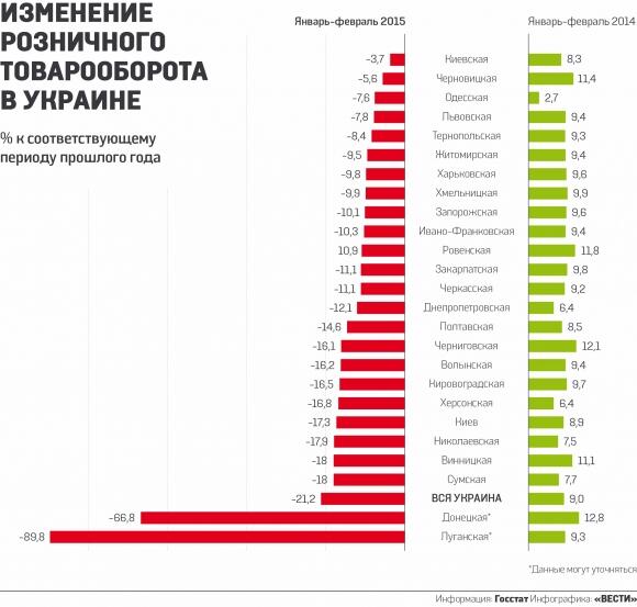 Свежие релизы статистического ведомства демонстрируют всю глубину падения внутреннего спроса в экономике Украины в первые месяцы 2015 г. По данным Государственной служба статистики, за январь-февраль в официальной сети было продано товаров на 140 млрд гривен. Это на 21,2% меньше, чем за соответствующие месяцы прошлого года.