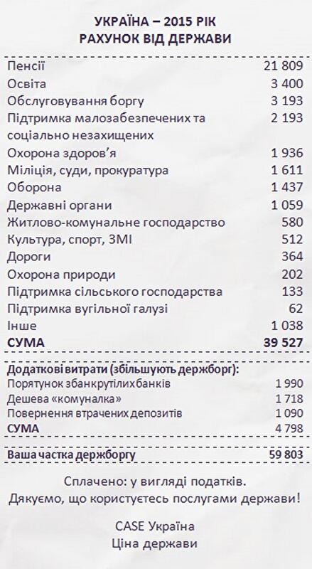"Кроме этого, в соответствии с утвержденным госбюджетом, ваша доля государственного долга возрастет минимум на 5000 гривен, из которых около 2000 грн из вашего кармана пойдет на спасение обанкротившихся банков, 1700 грн - это стоимость вашей "дешевой коммуналки", а 1100 гривен возврата утраченных вкладов пострадавшим от нового кризиса", - уточняет экономист.