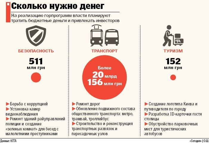 МНЕНИЕ. Эксперты признают, что все эти планы необходимы, но сомневаются в их реализации. "Сферу туризма поднимать нужно, ведь она приносит хороший доход в бюджет. То же касается и транспорта: городу не хватает новых развязок. Но суммы запланированы неподъемные — почти годовой бюджет Киева! Поэтому я сомневаюсь, что удастся полностью реализовать эти программы за три года. О безопасности в столице тоже стоит подумать. Но тратить миллионы на что-то необходимое, а не на ремонт фасадов", — уверен президент Института реформ и развития города Александр Вовченко.