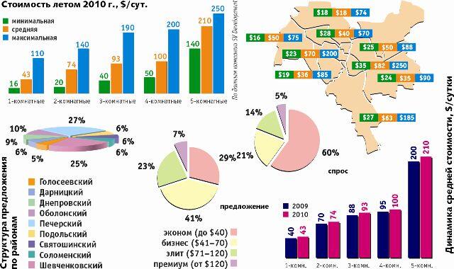 Нынешним летом открытые базы данных столичных квартир и апартаментов, предлагающихся в посуточную аренду, радуют приезжих в Киев командировочных и туристов обилием выбора: в начале июля на этом рынке насчитывалось порядка 5 тыс. подобных объектов, более 70% из которых были свободны. Но слабая востребованность данного жилья не повлияла на стоимость его аренды, остающейся стабильной на протяжении последнего года. По словам директора портала Kievsutki.com Андрея Ковальчука, владельцы подобных квартир и компании, занимающиеся их сдачей, за период кризиса попросту свыклись с падением уровня доходов. «Во время проведения крупных выставочных форумов подобного предложения в столице по-прежнему катастрофически не хватает, поэтому клиентов хватает всем. А вот в периоды отсутствия выставок, а также праздников, на которые в Киев съезжаются туристы, львиная доля сдаваемого жилья простаивает, к чему хозяева квартир относятся философски. Они уже не бросаются снижать цены, так как привыкли к нерегулярным финансовым поступлениям», — рассказывает он.