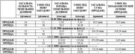 Окремого розгляду заслуговує позаконкурсний продаж земельних ділянок, який здійснюється депутатами на основі актів експертної оцінки землі початку чи середини 2006 року, у той час, коли ціна землі невпинно зростає у геометричній прогресії. Так, 28 вересня 2006 року депутатами було продано 16 ділянок за 19,5 млн. грн., в той час, як на аукціоні за 11 ділянок Київрада планувала отримати не менше 40 млн. грн. 31 жовтня 2006 року Київрадою на позаконкурсний продаж було виставлено 15 ділянок за 214,5 млн. грн.