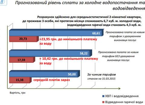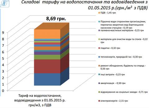 Згідно з розрахунком тарифу, оприлюдненим на сайті водоканалу, у кожному кубі води кияни платитимуть: 2,15 – електроенергія, 0,71 – на соцзаходи, 0,5 – амортизація, 0,23 – інші витрати, 0,56 – ремонт обладнання, 0,3 гривні – природний газ, 0,32 – податки, 0,22 матеріали для очистики води та стоків, 0,15 – паливно-мастильні матеріали, 0,19 – підкачка води та 1,45 гривні – ПДВ.