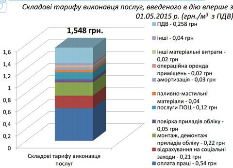| Також з 1 травня встановлено новий тариф, який включатиме затрати на обслуговування споживачів, повірку, монтаж і демонтаж квартирних лічильників, друк квитанцій тощо. |