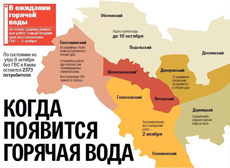 В "Киевэнерго" говорят, что согласно графикам компании завершение ремонтных работ и, соответственно, полное восстановление подачи горячей воды во всех районах планируется до ноября. К слову, не отключали воду лишь ТЭЦ-4, обслуживающей Дарницкий район. "Дарницкая ТЭЦ может работать как на газу, так и на угле. Потому перебоев с горячей водой не было", — поясняет эксперт Ассоциации городов Украины Александр Мазурчак .