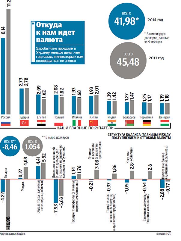 ПРИЧИНЫ . Эксперты говорят, что платежный баланс отрицателен из-за ряда факторов. "Падение в 15 раз "плюса" по услугам объясняется прежде всего уменьшением транзита газа и транспортных перевозок через Украину. Также в прошлом году мы получили почти на $3 млрд кредитов больше, чем отдали, в этом году — минус $1 млрд. Внесло свой вклад и население: из банков изъяли и купили валюты на $3,4 млрд больше, чем положили и продали, — говорит президент Украналитцентра Александр Охрименко. — По-прежнему в основном везут и пересылают деньги лишь заробитчане: год назад было $7,28 млрд, сейчас — $5,55 млрд". Падение коснулось и инвестиций: если год назад плюс по всем инвестициям был почти на $5 млрд, то в 2014-м инвесторы забрали на $580 млн больше, чем вложили.