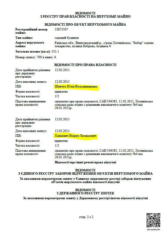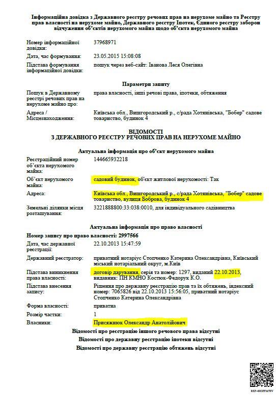 Майновий реєстр висвітлив ще один примітний факт: і землю, і будинок на ній Присяжнюк отримав у подарунок у жовтні 2013 р. Попередніми власниками маєтку були Юлія Шевчук і Віорел Ханкевич. Останній у 2011-12 р.р. очолював розрахунковий департамент «Київводоканалу», після того – ДП «Державний центр інформаційних ресурсів України». Цікаво, за що такі коштовні дари.