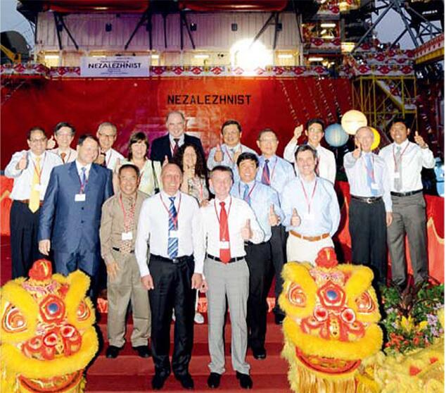 Голова “Нафтогазу” Євген Бакулін і замголови “Чорноморнафтогазу” Олександр Кацуба (по центру) разом з сингапурськими виробниками другої “вишки Бойка”, яка отримала офіційну назва “Незалежність”.