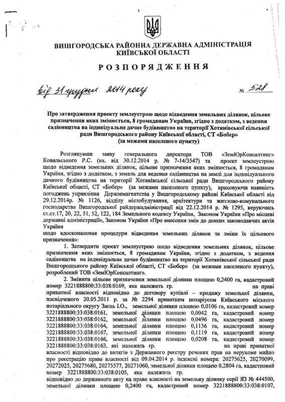 Вочевидь, в якийсь момент «садівники» усвідомили не надто певну кореляцію між документами й реальністю і вирішили переоформитися в «дачників». Аж у грудні минулого року. Коли всі вже давно було збудовано й оформлено. Аж тоді землю під ними пакетом – тобто одним спільним на всіх рішенням Вишгородської РДА – перевели із сільськогосподарської в «рекреаційну», а саме «під індивідуальну дачну забудову».