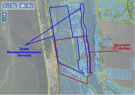 Червоним позначено територію садового товариства «Бобер», синім – ділянки лісгоспу