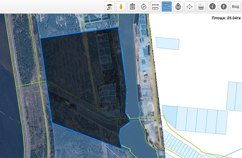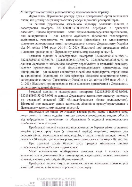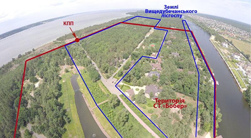 Дивимося знову на карту і в кадастр. Маєтки «бобрів» рядочком ідуть посеред дамби. Зліва тягнеться зелена зона, справа берегова лінія. Це землі державної власності і закріплені вони за ДП «Вищедубечанське лісове господарство».