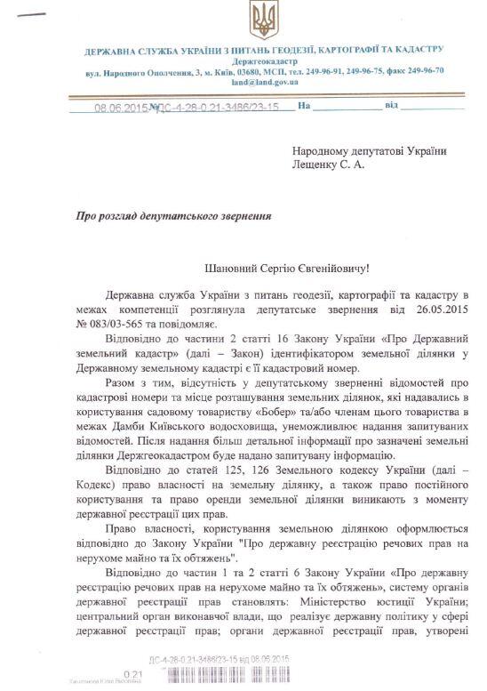 Ми спеціально, через народного депутата Сергія Лещенка, звернулися в Держгеокадастр, який відповів дослівно таке: «відомості про передачу даних земельних ділянок в оренду/користування в Державному земельному кадастрі відсутні».