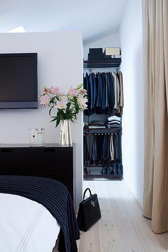 Здесь многое зависит, прежде всего, от площади помещения. Шкаф-купе и отдельно стоящий гардероб подойдут для небольшой спальни, а если площадь помещения позволяет, то лучше сделать просторное и структурированное вместилище для одежды – чтобы различным предметам гардероба соответствовали определенные отсеки. Вход в гардеробную по возможности должен быть из спальни.