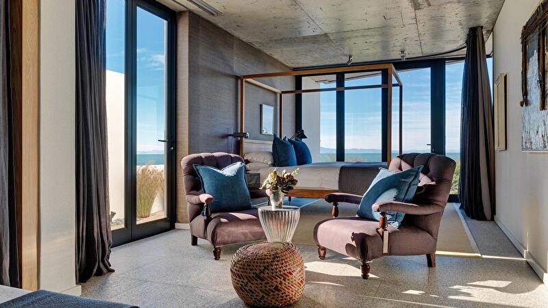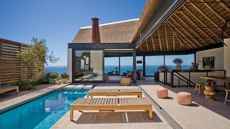 Дом был построен для молодой семьи, мечтавшей жить на побережье. Из окон открывается красивый панорамный вид на залив Святой Елены и Атлантический океан. Открытая планировка дома направленная на океан, небольшая площадь конструкции, уютный интерьер и красивая мебель делает интерьер по-настоящему комфортным. В доме 4 спальных комнаты, имеется небольшой бассейн, камин и отдельный спуск на пляж. Искупаться на нем вряд ли получится, но прогуляться по берегу можно в любое время.