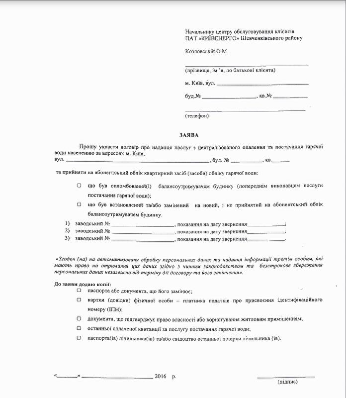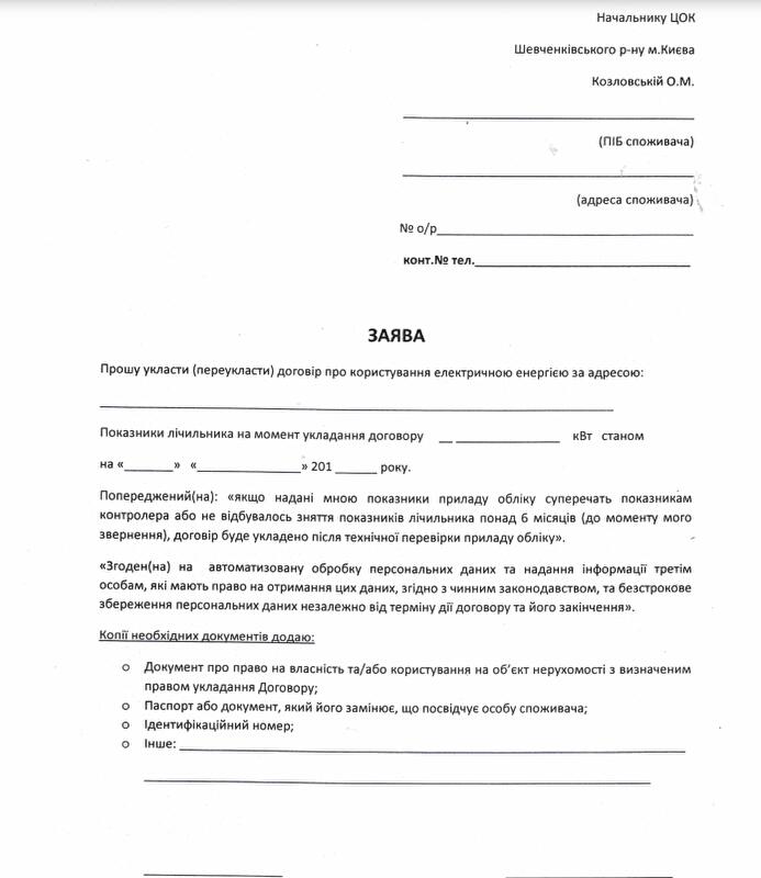 В ЦОК "Киевэнерго" клиенту выдают бланк заявления с просьбой заключить с ним договор. Заявление пишется на имя начальника ЦОК, полномочиями которого при таких обстоятельствах никто не интересуется. Смысл подобного заявления, не предусмотренного вообще нигде и никем, а потому являющегося, так сказать, плодом творческой фантазии клерков "Киевэнерго", очевидно, состоит в следующем.