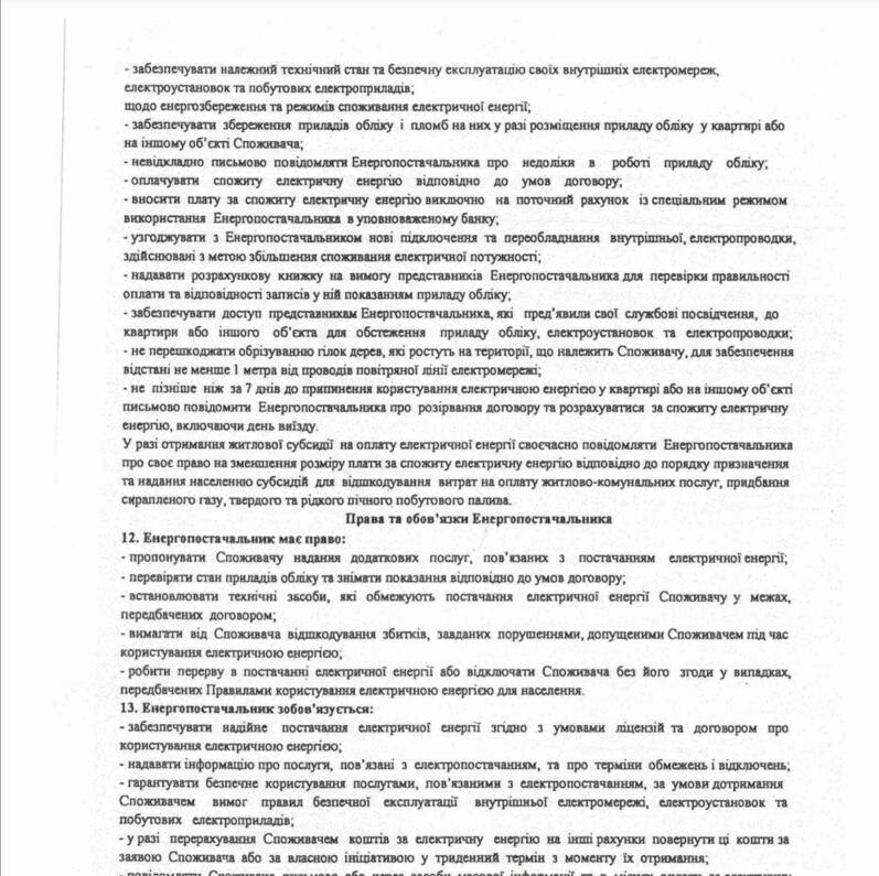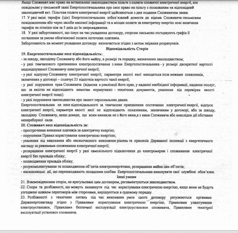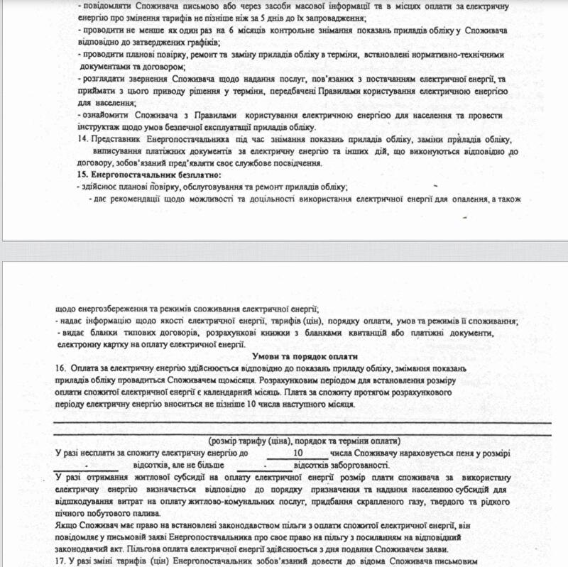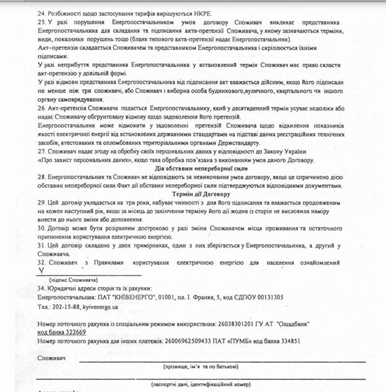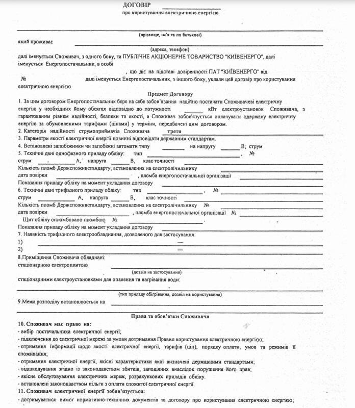 Кто подписывает договоры со стороны "Киевэнерго", так и осталось непонятным, но, судя по тому, что их выносят вскоре полностью оформленными, подписывает их все тот же начальник ЦОК с непонятными полномочиями. Получив заявления, копии паспорта и правоустанавливающих документов, в "Киевэнерго" выдают договоры, требуя подписать "здесь, здесь и здесь, где стоит птичка". Договор набран очень мелким шрифтом, который далеко не все прочтут даже в очках, повторяя таким образом "лохотрон", устраиваемый в банках при подписании договоров.