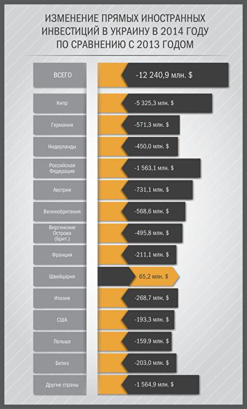 Из-за жестокого политического кризиса, который привел к войне на Донбассе, объем прямых иностранных инвестиций в Украину в 2014 г. по сравнению с 2013 г. снизился на 12,2$ млрд. Падение составило 17,5% за год.