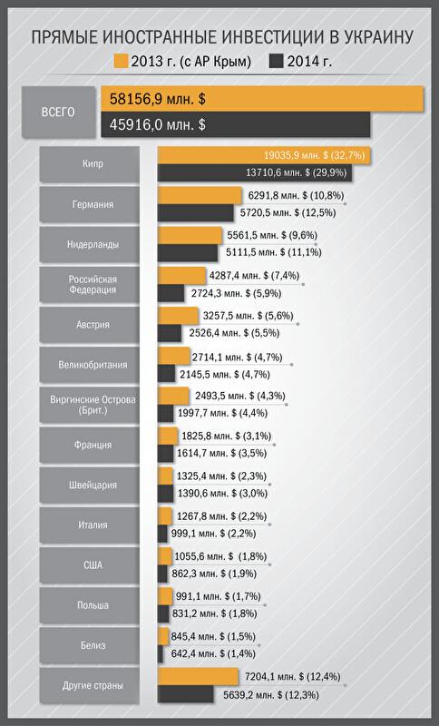 И первые, и вторые чаще всего используют для транзита денег Кипр, из которого в 2014 году в виде инвестиций в Украину поступило порядка 14 миллиардов долларов (30% от общего объема). Если к этой сумме добавить Российскую Федерацию как страну происхождения капитала (2,7 миллиарда долл. или 5,9%), то по приблизительным подсчетам, эта категория инвесторов в прошлом году привела в экономику Украины около 16,5 миллиардов долларов, или 36% от общего числа инвестиций.