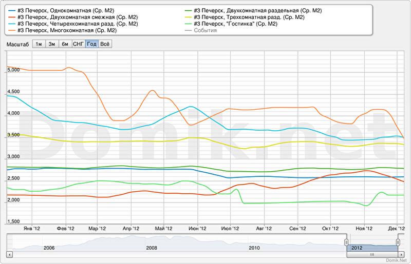 Самая высокая и самая низкая стоимость квадратного метра жилья на Печерске — не в массовых сегментах. Наиболее дешевыми, как и год назад, остаются редко, но все же, встречающиеся на Печерске, «гостинки» и «двухкомнатные смежные» квартиры. При этом, если «гостинки» в целом упали в цене на 7 %, то двухкомнатные смежные, наоборот, подорожали на 14 %. Впрочем, и тех и других слишком мало, а потому цену обуславливают индивидуальные особенности каждой квартиры.