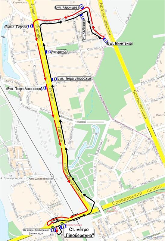 В направлении улицы Микитенко определены следующие основные остановки: «Станция метро «Левобережная», «Улица Петра Запорожца», «Авторынок», «Улица Генерала Карбышева», «Улица Ивана Микитенко».