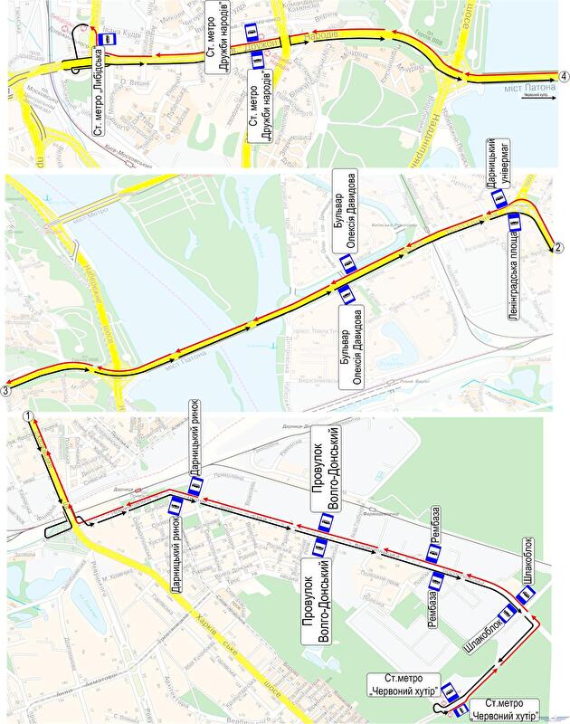 В направлении станции метро «Красный хутор» определены следующие основные остановки: «Станция метро «Лыбидская», «Станция метро «Дружбы народов», «Бульвар Алексея Давыдова», «Ленинградская площадь», «Дарницкий рынок», «Переулок Волго-Донской», «Рембаза», «Шлакоблок», «Станция метро «Красный хутор».