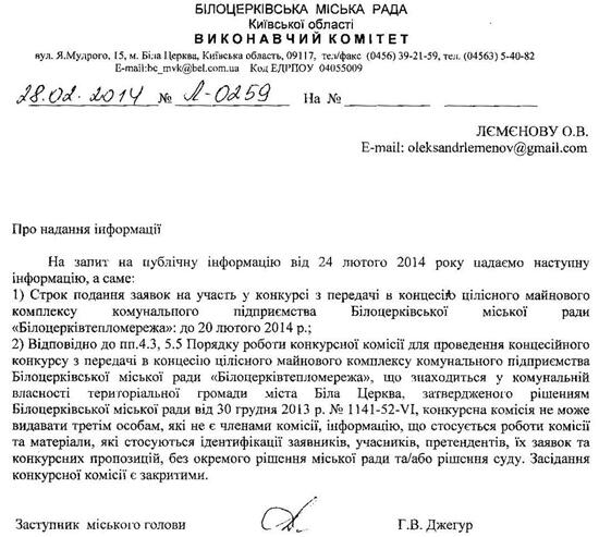 Таким чином, затвердивши цей документ, Білоцерківська міськра рада порушила фундаментальні права громадян. На початку 2014 року автор намагався отримати список учасників концесійного конкурсу і отримав відмову.