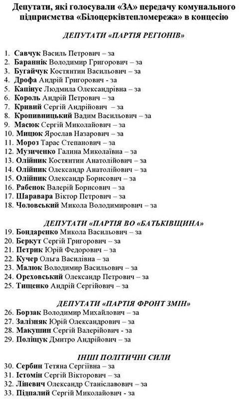 Депутати проголосували за відповідне рішення та передали на 30 років найцінніший актив Білої Церкви до приватних рук. Руки підняли 33 представники громади - в основному екс-"регіонали" та більшість депутатів від "Батьківщини".