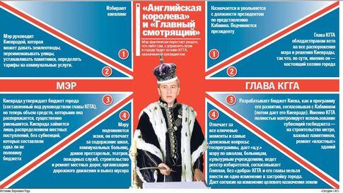 РАЗДЕЛИЛИ . Полномочия мэра и главы КГГА по новому закону теперь разделены. Если раньше главой КГГА становился мэр, которого избрали киевляне, и его своим указом утверждал президент, то теперь его назначает президент по представлению Кабмина. Исполнительным органом Киеврады является КГГА, которая параллельно выполняет все государственные функции. Киеврада может создавать свой исполком, который будет распределять деньги, которые будут поступать в городскую казну. Но, учитывая отношение центральной власти к киевской, о чем говорят многочисленные уголовные дела, мэру не дадут возможности действовать самостоятельно. Все его действия будут под контролем — распределение денег, земли, собственности. Мэр не сможет подписать ни одно решение Киеврады без резолюции главы КГГА, как контролирующего органа.