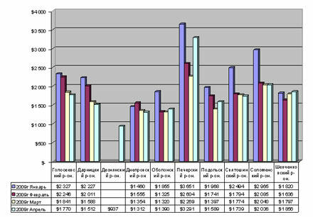 Наиболее низкие расценки отмечались в Деснянском ($937 за "квадрат"), Днепровском ($1 312 за "квадрат", в марте - $1 354) и Оболонском районах столицы.