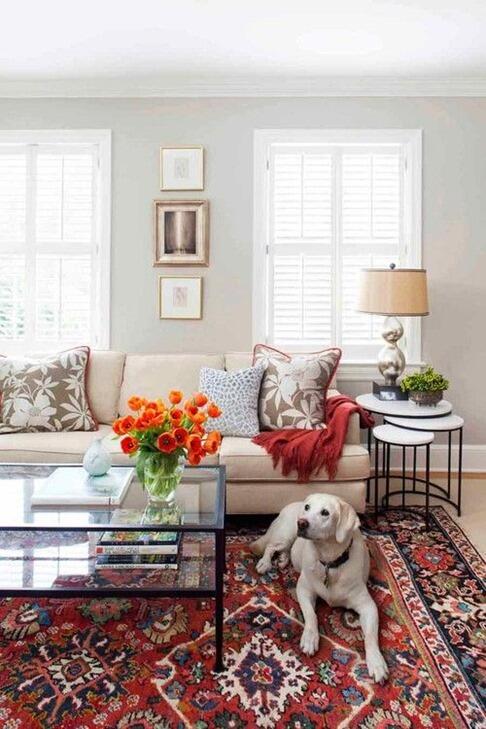 Если цвета узора на ковре сочетаются с предметами интерьера и декора , можно получить интересный вариант зонирования, при помощи ограничения пространства цветом.