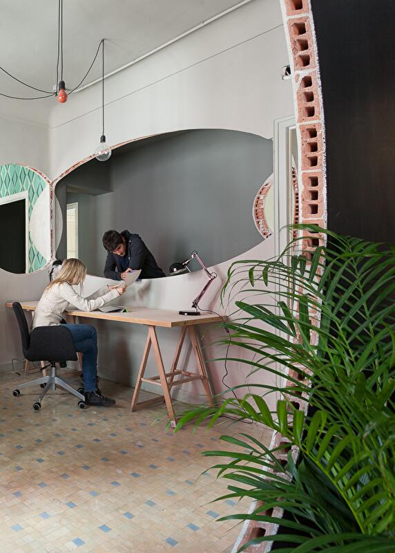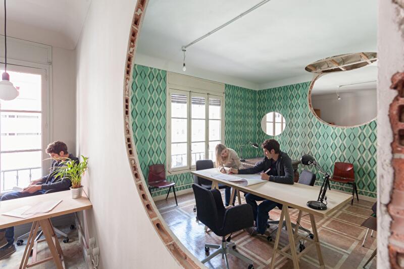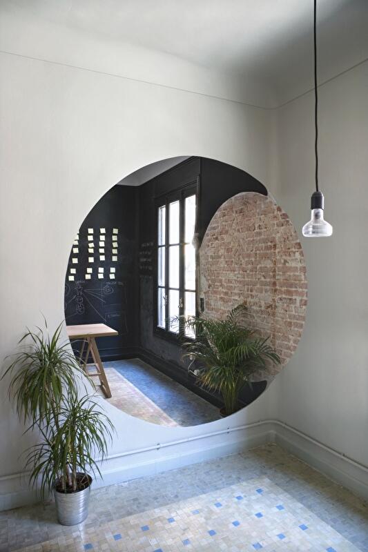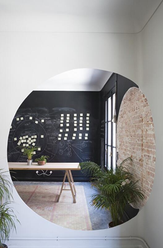Главная дилемма, с которой столкнулись архитекторы CH+QS arquitectos – что делать с многочисленными перегородками, разделяющими пространство старых апартаментов на изолированные комнаты. Ведь, учитывая солидный возраст самого здания, сносить их было нежелательно, но все же необходимо: концепт коворкинг-офиса предполагает открытое пространство.