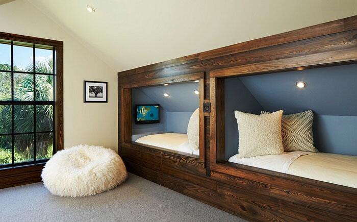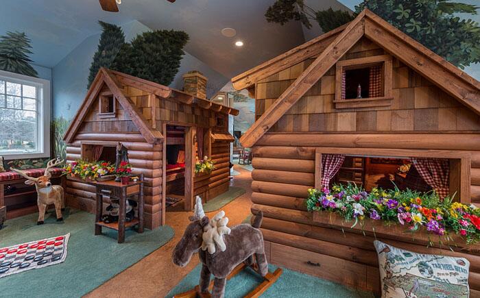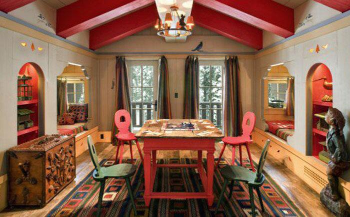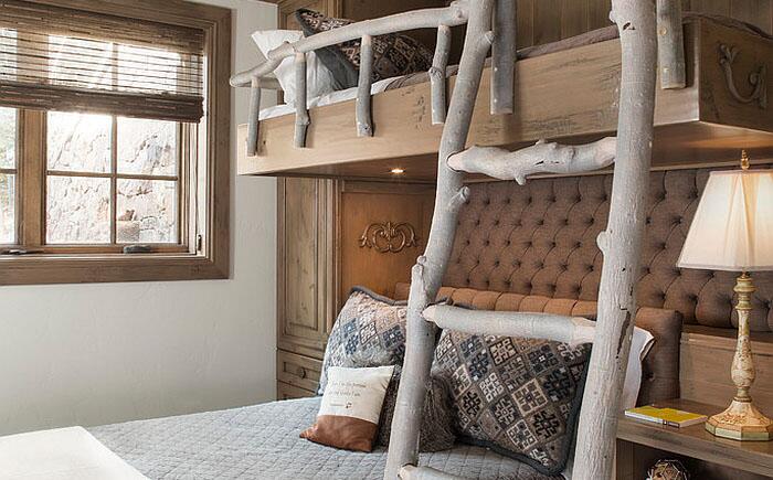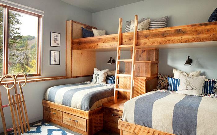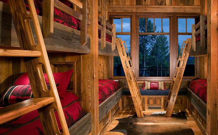 Спальня в стиле шале отлично подойдёт для многодетной семьи. Здесь уместно будут смотреться двухъярусные кровати. Дополнить их можно деревянными лестницами и встроенными ступеньками. Дерево, используемое в интерьере, не просто создаёт текстурный контраст, благодаря ему появляется мягкая фантастическая атмосфера. Если предусмотреть дополнительное свободное пространство и место для хранения игрушек, то спальня может выполнить и роль игровой.