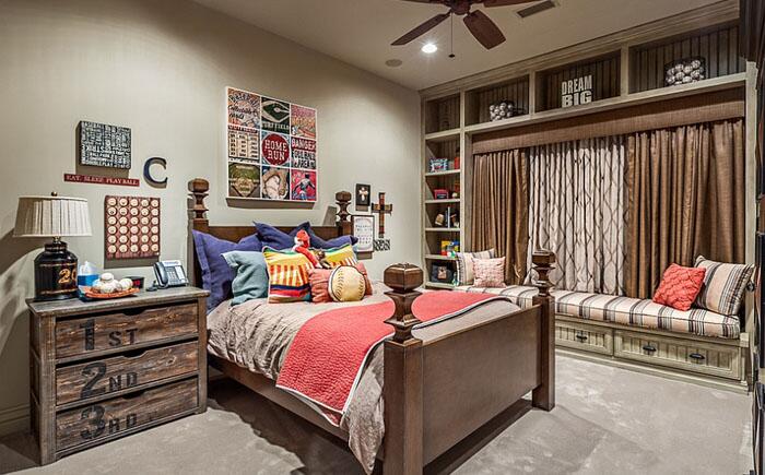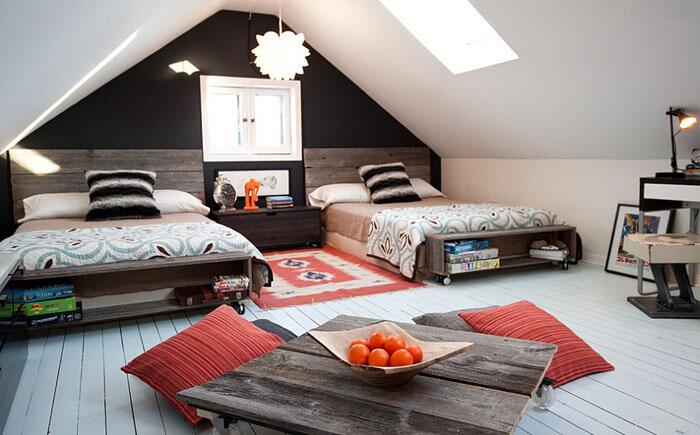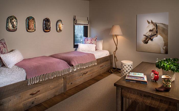 Понятие «рустикальный» совсем не подразумевает старые и бывшие в употреблении вещи, хотя с помощью некоторых цветов можно добиться подобного эффекта. Постельное бельё, подушки – ещё один простой способ привнести цвет в спальню, сильно не влияя на общий вид. Можно креативно подойти к дизайну кроватей, игровых уголков и оригинальных лестниц. В спальне девочки гармонично будет смотреться какой-нибудь розовый акцент или пушистый белый ковёр, которые придадут комнате немного женственности. Для мальчика лучше выбрать стальную раму для кровати в минималистском стиле. Среди 25 основных элементов рустикального стиля легко подобрать что-то по душе.