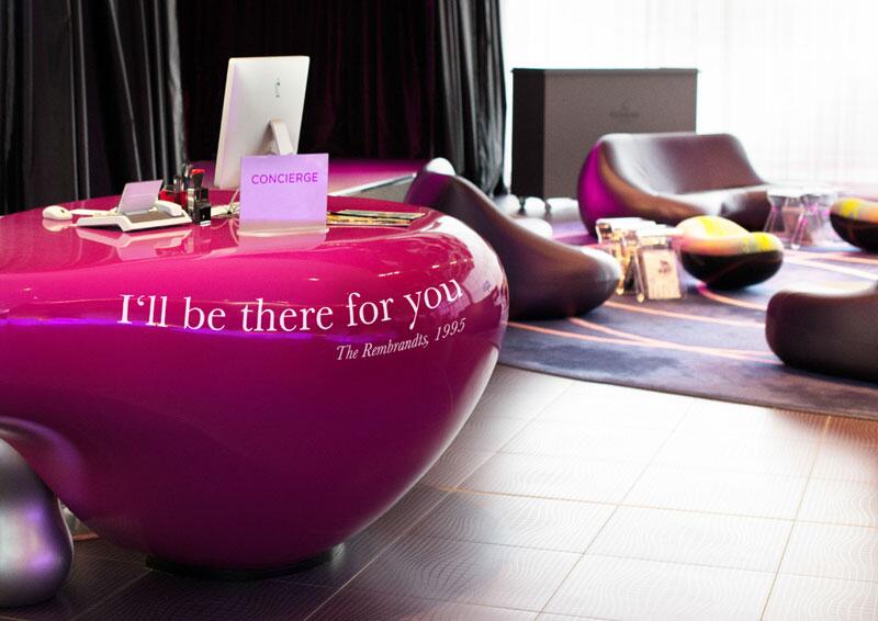 На стенах, различных предметах интерьера и даже на самих сотрудниках отеля присутствуют популярные фразы из известных песен, которые служат своего рода навигационным гидом и руководством к действию для постояльцев отеля.