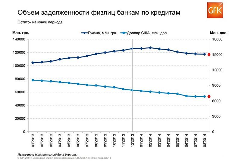 С одной стороны, сложившаяся ситуация могла бы вызвать всплеск обращения украинцев ко всевозможным источникам получения необходимых средств. Однако, наученные горьким опытом, далеко не все из них спешили брать взаймы у банков или других кредитных организаций. При этом объем задолженности перед банками за последний год уменьшился. Страх оказаться "по уши" в кредитах без возможности их вернуть привел к тому, что не только долларовые кредиты (они стали настоящим бедствием в связи с девальвацией), но и гривневые стали неприемлемым способом решения финансовых проблем.