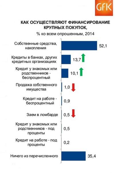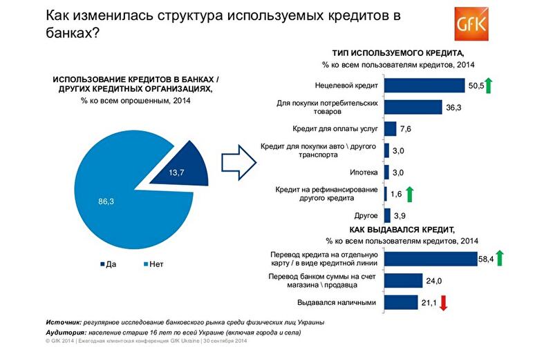 Только 13,7% участников исследования GFK Ukraine предпочитали решить свои финансовые проблемы с помощью кредитов. Понимание того, что отдать долг еще и с внушительными процентами может быть затруднительно (рост цен приводит к большим тратам основных средств, часть которых приходилось бы возвращать по кредиту, нестабильный рынок труда не дает уверенности в завтрашнем дне), привело к более взвешенным решениям. В то же время, есть люди, которые либо вынуждены брать взаймы у банков, или же они уверены в своей платежеспособности.