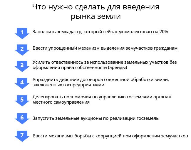 Затем переходный период продлится два года. За это время будут созданы все необходимые механизмы, после чего рынок земли заработает без ограничений. Первый этап запуска рынка земли запланирован не ранее 2017 года.