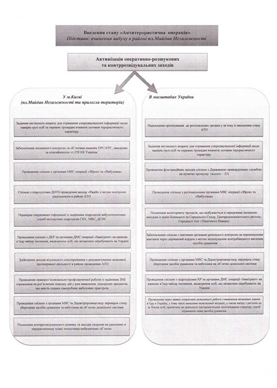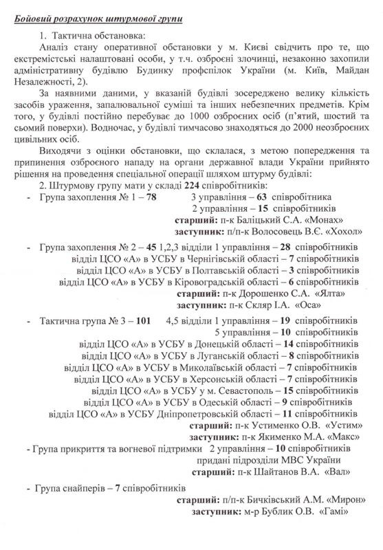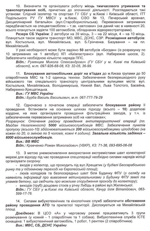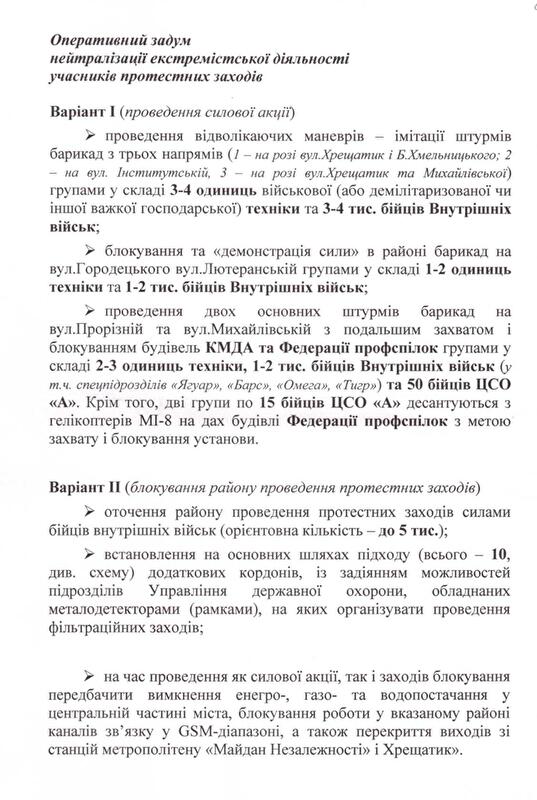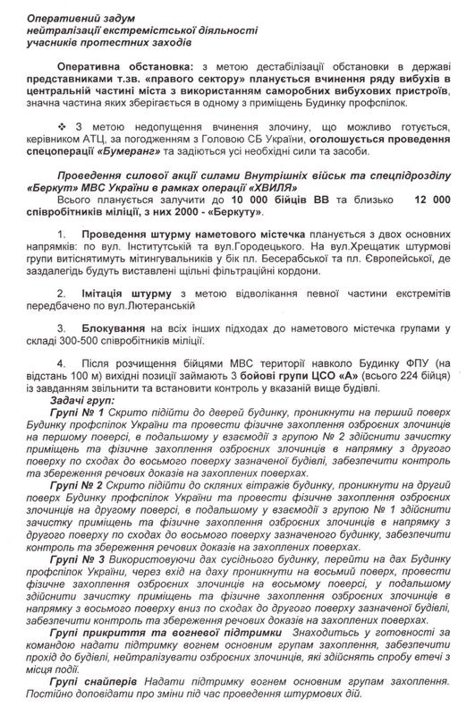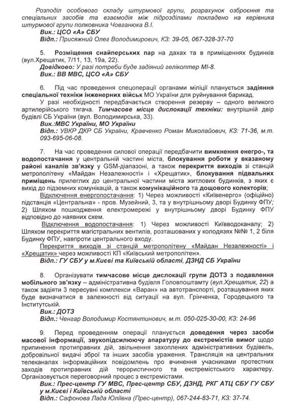 З огляду на це я вирішив оприлюднити частину планів “Хвиля” та “Бумеранг” — документи, які доводять, що снайперами на вул.Інститутській були бійці підрозділу спеціальних операцій внутрішніх військ, яким керує полковник С.Асавалюк, та бійці підрозділу внутрішніх військ “Омега”. Крім того, вказівку на застосування зброї колишній міністр МВС В.Захарченко дав спецпідрозділу ГУБОЗ МВС “Сокіл”. Надаю прізвища та номери телефонів керівників підрозділів, що брали участь у силовому розгоні акцій протесу. На підставі цих даних Генпрокуратура має відкрити кримінальні провадження. Після цього я добровільно передам слідчій групі ГПУ решту матеріалів, які вказують на причетність до кривавих подій міністра МВС В.Захарченка (котрий особисто заявив 20 лютого, що віддав наказ про застосування бойової зброї), його заступника В.Ратушняка, начальника департаменту громадської безпеки МВС О.Крикуна, командувача внутрішніх військ МВС С.Шуляка, в.о. начальника ГУМВС у м.Києві В.Мазана, голови СБУ О.Якименка, його першого заступника В.Тоцького, начальника УСБУ в Києві та Київській області О.Щоголєва, командирів підрозділу СБУ “Альфа”. Допомогу в підготовці спецоперацій МВС та СБУ надавав колишній перший заступник ГРУ Російської Федерації, котрий проживав у готелі “Київ” (його проживання й харчування оплачувала СБУ). Українська влада задіяла фахівця з Росії, оскільки наш очільник СБУ виявився льотчиком, а міністр МВС — ОБХСС-ником. Всі дані росіянина будуть надані Генпрокуратурі, а ступінь його вини хай визначає слідство. Крім того, я готовий передати Генпрокуратурі матеріали, які вказують, що при силовому розгоні акцій протесту МВС та СБУ діяли, як організоване злочинне угруповання.