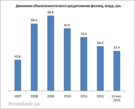 Не порадовали новостями и обычные ипотечные кредиты. В 2013 году, впервые со времени финансового кризиса 2008 г., общие объемы кредитования физических лиц выросли – на 4,5 миллиарда гривен или на 2,4% - до 192,7 миллиарда гривен (данные НБУ). Однако ипотеки рост не коснулся: объемы таких кредитов, выданных украинским заемщикам, снижаются уже четвертый год подряд. По результатам 11 месяцев 2013 года они уменьшились до 52,4 миллиарда гривен, потеряв более шести миллиардов, по сравнению с 2012 годом. Более того, объемы ипотечного кредитования по состоянию на 01.12.2013 г. достигли минимального значения за последние шесть лет: меньшим объем был только в 2007 году – 40,8 миллиардов гривен (данные НБУ).